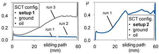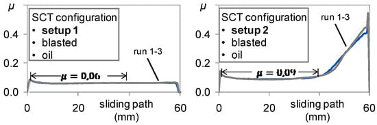 Figure 8 shows the comparison of the determined friction coefficients using blasted sample surfaces with oil lubrication. When using setup 2, both higher friction and wear during the last third of the sliding path can be observed. In the first 2/3 of the sliding path, the coefficient of friction reaches and is 50% larger than the coefficient of friction for setup 1.