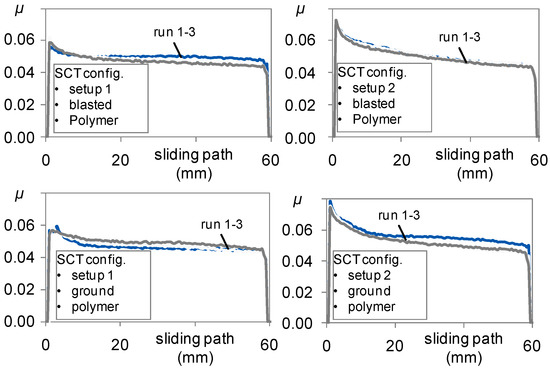 Comparison of development of friction coefficient polymer lubricated specimens for setup 1(left)/2(right) and blasted(upper)/ground(bottom) surfaces.