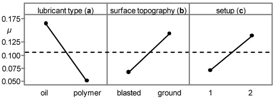 To summarize, the performed friction tests are analyzed regarding the medium friction coefficient (arithmetic average of all test runs within a sliding path length of ) and are evaluated with the help of design of experiments. The resulting main effect and interaction plots are depicted in Figure 11 and Figure 12, respectively.