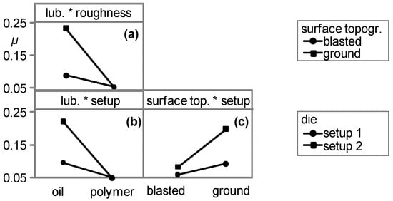 Interaction plots of lubricant and roughness (a), lubricant and setup (b), and surface topography and setup (c).