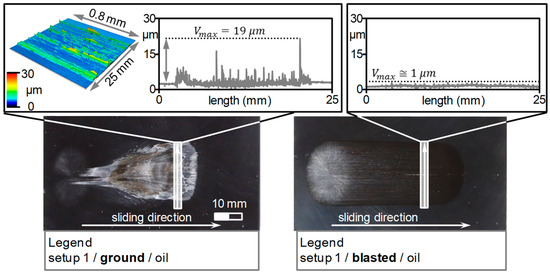 When using oil as lubricant, both the punch shape and the surface roughness influence the resulting friction coefficient significantly, see Figure 12a,b. The influence of the surface preparation in regards to wear is shown in Figure 13. While samples with a ground surface show clear adhesive wear marks on the sliding plate with a maximum height of Vmax = 19 µm, blasted surfaces lead only to slight, ridge-like wear marks with a negligible maximum height of Vmax ≌ 1 µm. The coefficient of friction also remains constant at for the entire sliding path of the blasted specimen (see Figure 8), while the friction coefficient reaches friction coefficients as high as (see Figure 9).