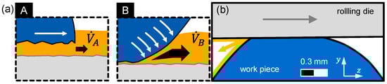 This also explains the non-existent influence of the oil during profile rolling. Due to the process kinematics, the lubricant is displaced from the contact zone by squeezing, see Figure 14b. This process is also supported by the very low surface roughness in the root radius and the profile flanks due to the repeated rolling over of the surfaces by the die.