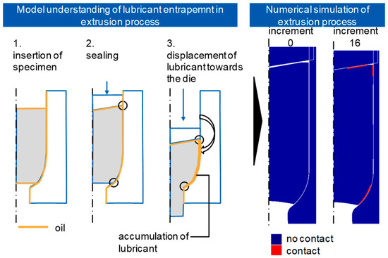 The entrapment of lubricant in extrusion processes may also lead to the formation of roughened surfaces due to the enclosed oil in extrusion processes, as is depicted in Figure 2. This understanding is depicted in Figure 15, left. At the time insertion of the specimen into the die, the surface of the specimen and die is covered with lubricant (oil). With the beginning of the forming operation, the punch comes into contact with the specimen. Lubricant thus cannot escape in the direction of the punch, while the same is true for the region within the die, where the specimen comes into contact (see Figure 15, right). Thus, lubricant accumulates within the die zone and leads to a roughening of the surface.