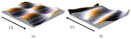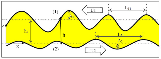 Our system is composed of a stationary rough seal and a moving rough shaft with a relative speed U2 in the x-direction (Figure 4a). The shaft surface h2 is defined by the expression in Equation (5).