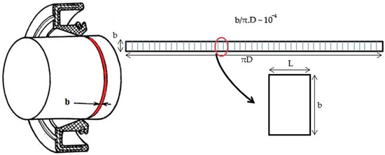 The lip roughness is considered periodically distributed along the x-direction with a period cell L. Through this periodicity, it is possible to simplify the calculation domain to one cell having L as length and b as width according to the circumferential direction [9] as shown in Figure 3. Then we deduce the boundary conditions to be applied as follows: