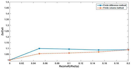 In this investigation, we dealt with an oblique groove form for the shaft surface (Equation (8)), and the groove angle was taken for α = 25°, and the groove number in the direction of the x-axis equaled 4000. Furthermore, the lip roughness considered is the one expressed by Equation (6) and we assume L11 = b, L12 = L, b = 0.5 × 10−4 m, L = 0.5 × 10−4 m, h0 = 1 × 10−6 m, μ = 2.5 × 10−2 Pa·s, pa = ps = 1.02 × 105 Pa, and A1 = 1 μm.
