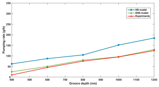 Thus, in this section, a comparative study is presented between a transient hydrodynamic model, a transient elasto-hydrodynamic model [6], and experimental results [7] examining the groove depth impact on the pumping rate.