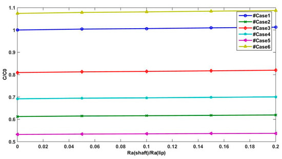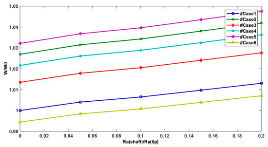 The non-dimensional lifting force W/W0, leakage ratio Q/Q0, and friction torque C/C0 were examined throughout their averaged values in one period (Equation (12)), where Q0, W0, and C0 define the parameters for Ra(shaft) = 0 related to case1.