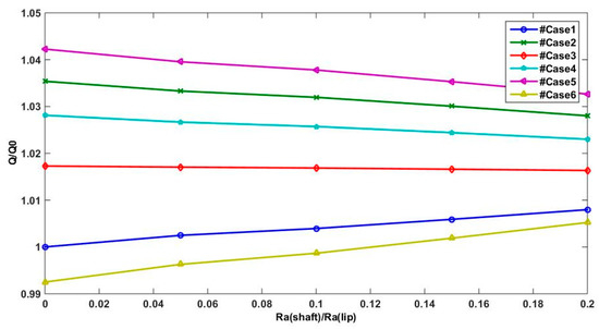 Figure 12 and Figure 13 show the effect of the relative velocity between lip and shaft surfaces on lifting force and reverse pumping rate. The two parameters (W and Q) are estimated when the shaft and lip surfaces are moving in a positive direction and the shaft speed is higher than the lip speed (case 5) and also For case 2 when only the shaft motion is considered. However, for the case 1 and case 6 when the shaft motion is not considered (U2 = 0) or the lip speed is higher than the shaft speed (|U2| < |U1|), we can note that the reverse pumping rate and the lifting force are underestimated compared to other cases. This result confirms that shaft motion is essential to generate substantial hydrodynamic pressure.