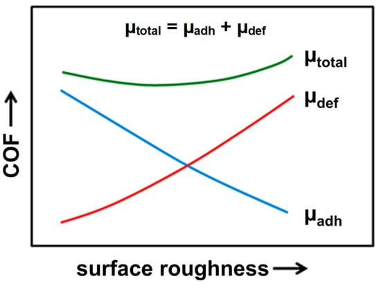 Influence of the surface roughness on the adhesive and deformative components of the coefficient of friction (COF or µ) (adapted from [9]).