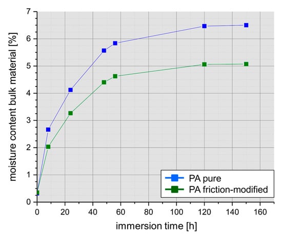 Measured moisture content of investigated pure and friction-modified PA6 polymers in function of water immersion time.