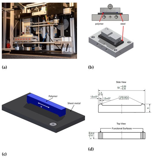 Test setup used for the tribological investigations: (a) modular designed tribometer, (b) close-ups of the testing geometry, (c) close-up of the tested samples geometry and (d) dimensions of the upper polymer sample.