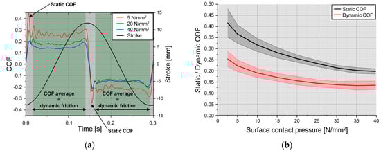 The main analysis of the obtained raw friction data consisted of the determination of static and dynamic coefficients of friction. This was performed firstly by searching the initial peak in the friction values at the beginning of each cycle and at the turning point (end of stroke); both points corresponding to the onset of motion of the samples and these two static friction values are identified by arrows in Figure 5a. On the other hand, the dynamic friction coefficients were calculated by averaging the raw sliding friction values between both turning points for each cycle. In order to take into account only stable raw sliding friction values, a time window eliminating 10% of the values at the beginning and at the end of a half-cycle was used, as shown by the green zones in Figure 5a. That means that the sliding COF is an average value over a range of different velocities as they occur due to the sinusoidal movement. With this calculation, the influence of the sliding velocity on the COF is lost but as it can be observed in Figure 5a, there is only a minor influence of the sliding velocity on the COF within the used velocity regime. It is important to note that the diagram shown in Figure 5a shows only 1 complete linear reciprocating cycle of the corresponding tests at different contact pressures. It is also worth noting that the analysis of the raw signals was performed not only on 1 cycle but the COF values were averaged over all 5 strokes of each load step and within each load step, no specific trends in the measured COF values could be observed.