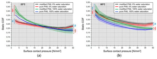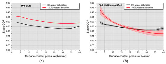 For both investigated polymers at low normal loads, static friction coefficients were higher for wet (100% water saturation) than for dry (0% water saturation) samples, due to the softening of the polymer through higher water absorption and the consequent higher induced deformative friction (Figure 7). However, for friction-modified PA6 at high contact pressures (Figure 7b), this friction increase due to moisture was not observed anymore, since penetration depths of the steel plates into the highly moisturized PA6 polymer reach a saturation state and therefore the compressive yield stress of the polymers determines mostly the friction behaviour.