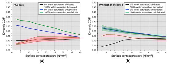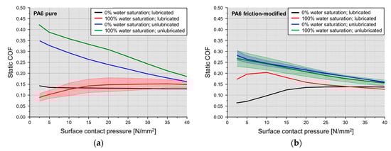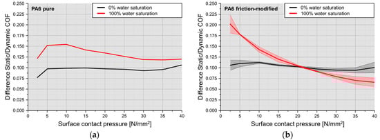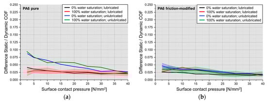 To perform a more detailed analysis of the obtained results, the influence of the use of lubrication in the tribological contact may be analysed by comparing results shown in Figure 10, Figure 11 and Figure 12. In these diagrams, it may be observed that tests performed under lubricated conditions at a specific water saturation level deliver similar friction behaviours for pure PA6 but small divergences are observed for the friction-modified PA6 at low surface contact pressure values. On the other hand, for tests performed under unlubricated conditions, different friction behaviours are observed. For the friction-modified PA6, both static (Figure 10b) and dynamic (Figure 11b) frictions are, independently from the water saturation level, slightly higher for the unlubricated than for the lubricated conditions but the overall difference between static and dynamic frictions (Figure 12b) stays approximately equivalent. For the pure PA6, a significant increase of static (Figure 10a), dynamic (Figure 11a) as well as the difference between both frictions coefficients (Figure 12a), independently from the water saturation level, may be observed when performing the tests under unlubricated conditions in comparison to lubricated ones. This behaviour is due to the well-known ability of lubricants to lower the adhesive part of friction.