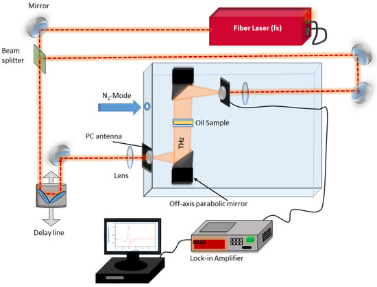 The THz-TDS spectrometer used in this study was similar to the one used in prior studies of oil [34]. In the current setup, a fiber-based femtosecond laser (T-Light from Menlo Systems) with a central wavelength of 780 nm was used to excite charge carriers in the photoconductive antennas. Voltage applied to the emitter antenna was modulated and the lock-in technique was used for the current detection, which was induced by THz radiation hitting the detector. THz signals were recorded in the time-domain by gating the detector with time-delayed laser pulses. The pulse delay was controlled by a mechanical delay line. A pair of off-axis parabolic mirrors was used to collimate, guide and focus THz radiation. The sample was positioned into the collimated part of the THz beam path as shown in Figure 2. Transmission measurements with the oil sample (sample measurement) and without the sample (reference measurement) were conducted under nitrogen atmosphere.