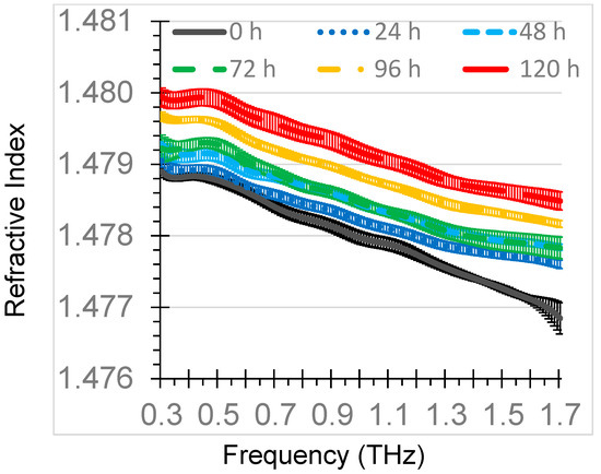 The means of the refractive index at 1.0 THz for 0 h, 24 h, 48 h, 72 h, 96 h, and 120 h were 1.4780, 1.4782, 1.4783, 1.4785, 1.4788, and 1.4791, respectively. The highest standard deviation of measurements for the samples at 1.0 THz was 0.0002. Increased oxidation time resulted in an increase in the refractive index. Some of the mean refractive index curves with 95% confidence interval bars did not overlap, indicating good discrimination among certain oxidation times.