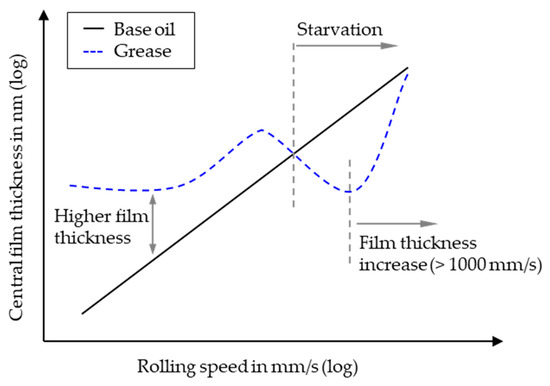 Rolling bearings are commonly lubricated using oil or grease to separate the contacting surfaces and reduce friction and wear. Among operational conditions, such as temperature, rotational speed, or vibrations, the service life of rolling bearings significantly depends on the lubricating film thickness in elastohydrodynamic (EHD) contacts. In fully flooded applications, the lubricating film thickness is mainly determined by the rolling speed and the lubricant viscosity. If the lubricant supply is limited, a full film formation cannot be guaranteed for the entire range of rolling speeds. Thus, the film thickness decreases due to a lack of lubricant supply, which is referred to as starvation [1,2]. Grease lubricated rolling bearings are usually not fully flooded, so that starvation is likely to occur [3]. It is assumed, that the film formation in grease lubricated contacts is mainly determined by the bleed oil, which is released by the grease during operation [4]. Moreover, the film formation is affected by the grease thickener, which forms semi-solid layers on the contacting surfaces, or by free thickener particles entering the Hertzian contact zone within the bleed oil flow [3,4,5,6,7]. Thus, the film thickness of grease lubricated contacts differs from that of base oil lubricated contacts, as shown in Figure 1. The figure shows the schematic film formation for a fully flooded base oil lubricated contact and grease under starved lubrication. Measurement results presented in [8] show a similar behavior of the film formation using a ball-on-disc tribometer. Usually, in fully flooded oil lubricated contacts, the film thickness rises with increasing rolling speed. At low rolling speeds the film thickness of grease lubricated contacts is usually higher than that of the corresponding base oil [8,9,10,11,12]. This effect is induced by the grease thickener, which is deposited on the contacting surfaces and forms a layer leading to a higher film thickness at low rolling speeds [6,8,13,14,15]. Moreover, free thickener particles within the bleed oil flow can enter the contact area, which also leads to a higher film thickness [7,8,16,17]. At a characteristic rolling speed, grease lubricated contacts show a stagnation or even a film thickness decay with further increasing rolling speed [18]. Wilson [19] defines the onset of starvation, when the film thickness of the grease lubricated contact drops below the film thickness of the corresponding fully flooded base oil. This definition will be used in the following and the onset of starvation of the grease lubricated measurements is marked by a dashed line, as shown in Figure 1.