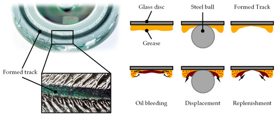 However, for an estimation of the service lifetime of grease lubricated rolling bearings, a fully flooded bearing and the corresponding base oil viscosity are commonly assumed [20]. This assumption results in an overestimation of the lubricating film thickness for rotational speeds in the range of starvation, which can lead to uncertainties in the bearing design. If the contact is not fully flooded, the lubricant supply is mainly determined by lubricant replenishment near the contact zone [21]. The mechanisms leading to the onset of starvation due to insufficient replenishment are explained in Figure 2 [18]. By shearing the grease during operation, bleed oil is released by the side-lying grease bulks and flows into the formed track and is available for the lubrication of the EHD contact [22,23]. The bleed oil is displaced by the rolling element and replenishes behind it, after an over rolling. This mechanism is referred to as replenishment and is mainly driven by surface tension as well as capillary forces [24,25,26]. At low rolling speeds, the bleed oil can completely replenish behind the rolling element and is available for the lubrication at the next over rolling. With higher rolling speeds, the time for the oil to replenish before the next over rolling is limited by the over rolling frequency. Thus, the lubricant supply decreases with higher over rolling frequency, which results in a lower film thickness than under fully flooded lubrication [21,24,25,26].