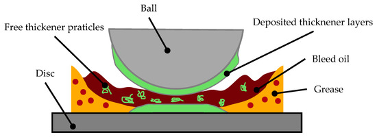 Moreover, it is generally assumed that the film thickness in grease lubricated EHD contacts is a build-up of layers of deposited thickener that forms on the contacting surfaces and bleed oil [6,8,13,15,21,32,33]. A schematic sketch of a grease lubricated contact is shown in Figure 3. The thickener is deposited on the surfaces of the ball and the disc and forms a semi-solid layer, which separates the surfaces [6,8]. Additionally, free thickener particles within the bleed oil flow lead to a higher film thickness, when entering the EHD contact [7,8,34].