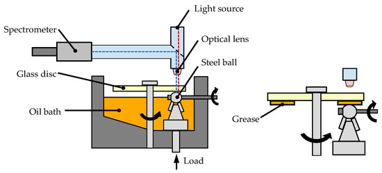 The film thickness measurements were performed on a ball-on-disc tribometer EHD2 from PCS Instruments. In this work, the central film thickness of oil and grease lubricated EHD contacts were measured at 40 °C and 700 MPa. A polished steel ball with a diameter of 19.05 mm was loaded with 47 N against a glass disc, such that an EHD contact was formed. Each surface had a roughness of approximately Ra = 0.02 µm, so that the surfaces were completely separated during operation for a wide range of rolling speeds. Thus, it can be assumed that the measurements were not performed in a mixed lubrication regime. Both the disc and the ball were driven, and the circumferential speeds were chosen, such that no sliding occurred and pure rolling was applied. The lubricating film thickness was measured by the principle of interferometry, which is described in detail in [35]. Figure 4 shows a sketch of the tribometer with the principle function. For the measurements with grease in a starved lubrication regime, the grease is initially distributed on the disc before the measurement, using a grease distributer as described in [18]. The distributed grease film has approximately a thickness of 0.1 mm and a width of 23 mm. At all measurements, the ball was placed on a disc radius between 36 and 42 mm.