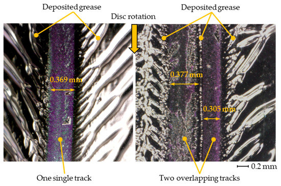 The measurements in this study were performed using two different measurement profiles. On the one hand, measurements at a constant rolling speed of 100 mm/s were performed and the film thickness is presented as a function of disc revolutions. On the other hand, measurements by increasing the rolling speed, as described in [18], were performed to identify the onset of starvation. All measurements were repeated to ensure reproducibility, and the mean values of three measurements are presented in the diagrams. In the case of measurements at constant rolling speed, the mean values were taken for interval steps of 30 measurement points. By measuring using the test setup with two ball specimens it is essential to ensure that both balls run on the same track radius. Therefore, the disc was examined directly after each measurement using a light microscope. Figure 6 shows an example of a track where both ball specimens ran on the same track radius (left) and an example where the track radius was slightly different (right). If both balls did not run on the same track, the results were rejected. The position of the second ball was then adjusted and the measurement was repeated. Following this procedure, ensures that both balls run on the same track radius.