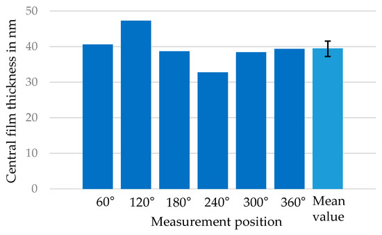 To investigate the effect of the thickener on the film formation in grease lubricated contacts, the thickness of the thickener layer was determined, as described in Section 2, at zero speed after the measurement. As presented in Figure 8, the central film thickness was measured at six positions around the measuring track on the disc. The results show a distribution of the thickener layer in a range from approximately 33 to 47 nm with a mean value of approximately 40 nm around the track. The standard deviation indicates a distribution of the thickener layer around the disc with low scattering.