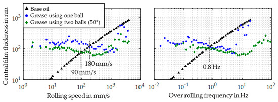 Figure 10 also shows the increase of film thickness at high rolling speeds >1000 mm/s in the range of starvation. As discussed in the introduction, this increase can either occur in a recovery phase due to shear degradation of the grease [8,31,32] or due to centrifugal forces as proposed in [18]. If the increase is related to shear degradation, it would be dependent on the number of contacts by the rolling elements. This implies a faster shear degradation using two balls, since the number of contacts is doubled in comparison to a measurement using one ball. A faster shear degradation would lead to an early onset of the recovery phase, when measuring with two balls. Thus, the increase in film thickness would be expected at lower rolling speeds than measuring with one ball. However, as shown in Figure 10, the increase in film thickness occurs at a similar rolling speed (left diagram) and is independent of the over rolling frequency (right diagram). This indicates, that centrifugal forces become dominant at rolling speeds >1000 mm/s and push the side lying grease into the contact area, which leads to an increase in lubricant supply and film thickness in the range of starvation.