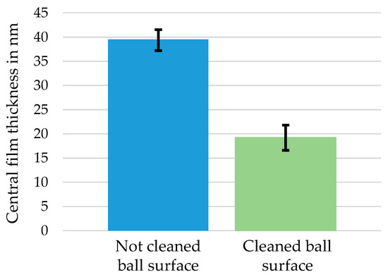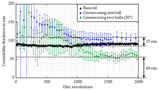 Moreover, the results of the measurements at constant rolling speed allow conclusions regarding the effect of the thickener on the film formation. Comparing the measured thickness of the thickener layer at zero speed with the results of the film thickness measurements, a correlation can be observed between the film thickness of the thickener layer and the film formation during operation. Figure 11 emphasizes that the film thickness of the grease lubricated contact at 100 mm/s using one ball is approximately 25 nm higher than the corresponding base oil film thickness. Assuming a sufficient lubricant supply at a low over rolling frequency of 0.4 Hz and considering the results of the measurements at zero speed, shown in Figure 8, the higher film thickness is likely to occur due to a deposited thickener layer. Using the test setup with the second ball at an angular position of 50°, the residual film thickness does not reach a zero level, although a zero-film thickness would be expected due to displacement of bleed oil and insufficient replenishment at a high over rolling frequency of 3.0 Hz. However, a residual film thickness of approximately 40–60 nm is reached; and thus it can be concluded that the thickener layer supports the separation of the surfaces although most of the bleed oil in the track is displaced. The assumption of the formation of a thickener layer, which supports the film thickness, is in accordance with the literature [6,8,13,15,21,23,32].