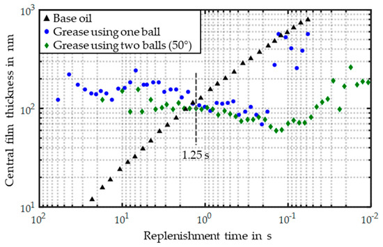 Based on the assumption that the replenishment of bleed oil significantly affects the film formation and especially the onset of starvation, the investigation of the replenishment time can be useful to determine the lubricant supply. Therefore, the replenishment time for oil lubricated contacts under starved conditions has already been investigated by several authors [26,28,29]. The diagram in Figure 13 shows the dependence of the film thickness on the replenishment time to emphasize the correlation of the flow behavior of the investigated lubricant. The onset of starvation can be determined at 1.25 s, which is equal to 0.8 Hz as shown in Figure 10. Thus, the minimum time that is necessary for a reflow ensuring a sufficient lubricant supply, such that no starvation occurs, can be determined from Figure 13 to be >2.0 s. These results are in accordance with results for oil lubricated contacts under starved lubrication presented in [29].
