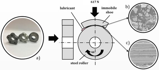 The roller–shoe scheme of friction tests; samples of aluminum antifriction alloys and the steel roller (a); Al alloys (b); steel surface (c) after friction.