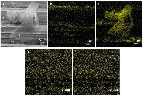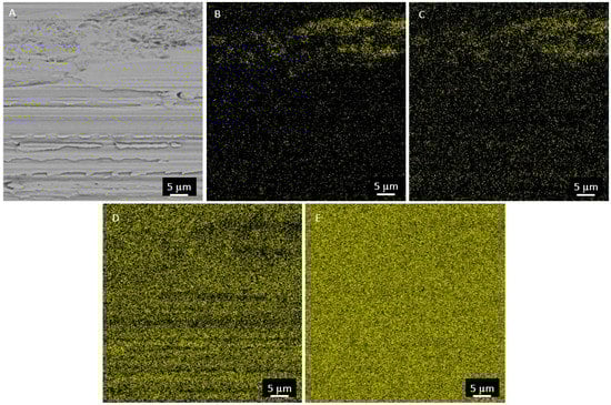 Figure 6 shows distribution maps of elements of secondary structures. Each observed area contained oxygen, which is a part of a metal-polymer film. Local spectrum analysis revealed that areas with the highest iron content do not contain oxygen (<0.1%) but do contain fluorine (1.5% F). Oxygen was not detected in the fluorine-rich areas (Figure 6C,D). Fluorine distribution maps in most cases coincide with iron ones (Figure 6D,E). However, in the zones enriched with aluminum and oxygen, content of fluorine decreases. Additionally, the presence of fluorine reduces the importance of carbon and oxygen, having little effect on the metallic ingredients of secondary structures.