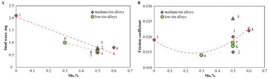 The effect of molybdenum on the friction coefficient (Figure 4B) can be described by a nonlinear dependence. The friction coefficient decreased from 0.019 to 0.014 with 0.3% Mo content in secondary structures on the friction surface of steel samples. As the Mo content further increased the friction coefficient increased as well.