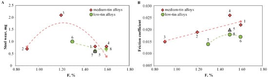 The tendency for the coefficient of friction to increase with an increase in the content of fluorine in steel is most pronounced in the interaction of steel with medium-tin alloys (Figure 5B). For them, the coefficient of friction is as follows: 0.015 (2), 0.019 (3), 0.020 (1), and 0.022 (4), with a range of concentrations of fluorine from 0.9 to 1.6% F. When working with low-tin alloys, except for the AO 7.6 (5) alloy, whose friction coefficient falls out of all the laws, the values are 0.014 (6), 0.018 (7), and 0.017 (5), which correspond to the curve with a maximum. In general, it can be claimed that fluorine contained in the secondary structures of the friction surfaces of steel specimens contributes to the growth of friction coefficient.