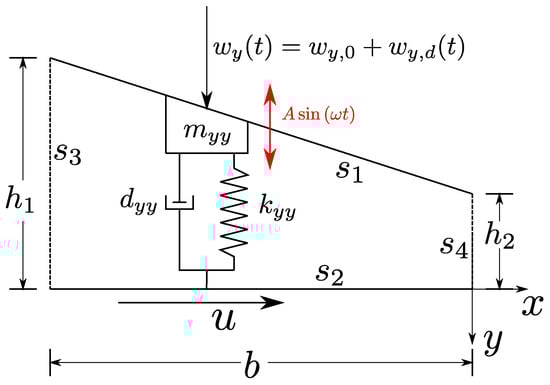 In Equation (1), the mass of the slider has been neglected and slider is constrained to move only in the y-direction and for which the initial position of the upper surface of the bearing is considered zero, . A notable feature of Equation (1) is retention of an added mass coefficient associated with inertia of the fluid. Snyder et al. [] previously demonstrated that lubricant inertia can cause an appreciable difference between the dynamic bearing stiffness () predicted using CFD (lubricant inertia present) and the static stiffness () predicted by the perturbed Reynolds equation (lubricant inertia neglected).