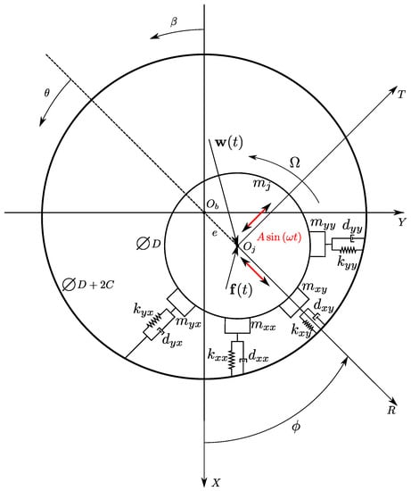 If a sinusoidal displacement of complex form is applied to the journal, then the corresponding output force will also be sinusoidal, . and are the complex amplitude vectors of the input displacement and the output force, respectively. Substituting these expressions into Equation (12), results into Equation (13).