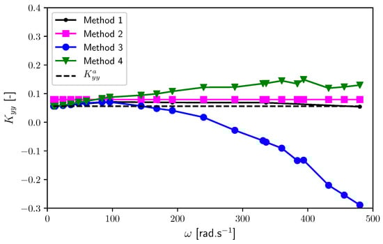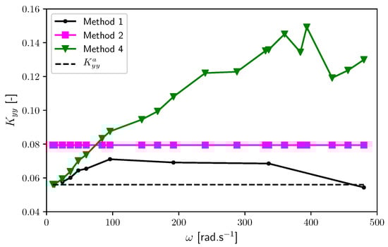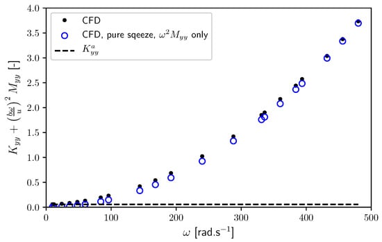 Method 1: The added mass coefficient is evaluated at each perturbation frequency from the pure squeeze CFD results. Using this technique, the added mass coefficient as well and as the static stiffness may exhibit frequency dependence. In this method, at each perturbation frequency, the dynamic stiffness predicted from the pure-squeeze CFD simulation is assumed to equal . Thus, the added mass coefficient is determined at the given excitation frequency. Then, this quantity is subtracted from the dynamic stiffness considering both squeeze and sliding, , leaving the static stiffness, .