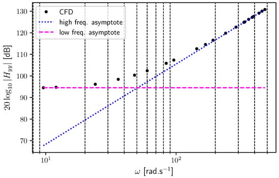 Method 4: The asymptotic behavior of the frequency response function, , in the high frequency limit is used to estimate the added mass coefficient []. In this method, the added mass coefficient is estimated using the Bode magnitude plot of the as depicted in Figure 4. The bode plot is consistent with the second-order linear system [] model assumed for hydrodynamic fluid film, and the plot exhibits both low and high-frequency asymptotic behavior.