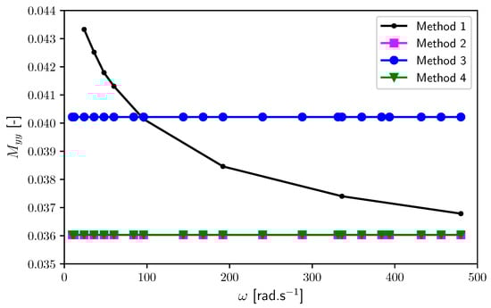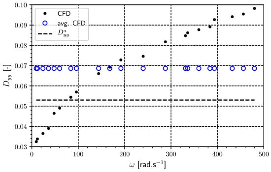 Combining Equations (27) and (28) at the largest value of (480 [rad·s]) results in a dimensionless added mass coefficient .
