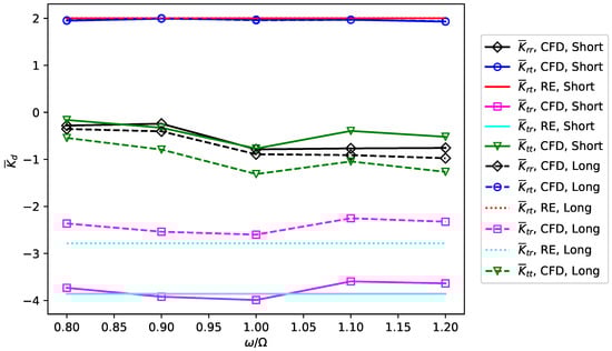 Figure 9 and Figure 10 are the dimensionless dynamic stiffness (added mass still present) and dimensionless damping coefficients, respectively, for short, , and long, , journal bearing geometries as a function of perturbation frequency ratio. The results were obtained in the absence of a cavitation model, i.e. solved subject to the full Sommerfeld condition. The perturbation frequencies were varied from 0.8× to 1.2× multiples of the rotational frequency . Performing the CFD simulations near the rotational speed alleviates the need to resolve multiple time scales (high frequency perturbation) or run the simulations for long physical time with a small time step (low frequency perturbation) []. At low perturbation frequencies, the simulation must be run for a long physical time to capture several oscillations of the perturbation boundary. However, the time step is constrained to a comparatively small value as dictated by the rotation of the shaft. For high frequency perturbations, the oscillation frequency reduces the required time step size below the value associated with resolving the rotation of the bulk fluid, i.e., the time step for the transient CFD simulation must be reduced.