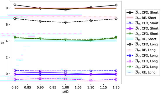 In Figure 10, the direct damping coefficients predicted from CFD and the perturbed Reynolds equation compare well. The invariance of the direct damping coefficients with perturbation frequency is consistent with results of Ha and Yang [] who found the damping coefficients to be sensitive to perturbation frequency only at larger eccentricities.
