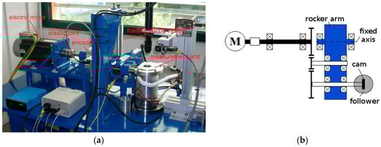 (a) Picture of the experimental apparatus for testing cam-follower contacts; (b) Schematic drawing of the apparatus.
