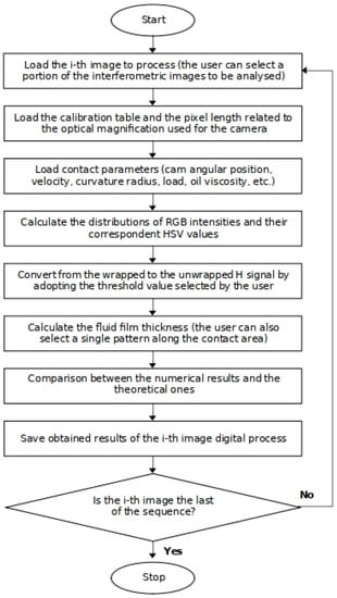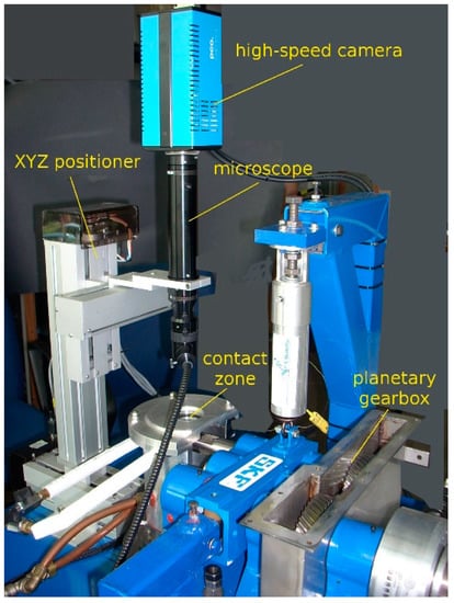 For the analysis of the large number of images recorded by a high-speed camera, a program for automatic digital image processing was developed for point contacts by the authors’ research group []. It was used for the analysis of interference images obtained in tests with constant load and geometry but variable speed using a ball-on-disc experimental apparatus. A test rig was successively designed and realized for a more realistic simulation of gear teeth and cam-follower contacts. The rig was tested using circular eccentric cams [].