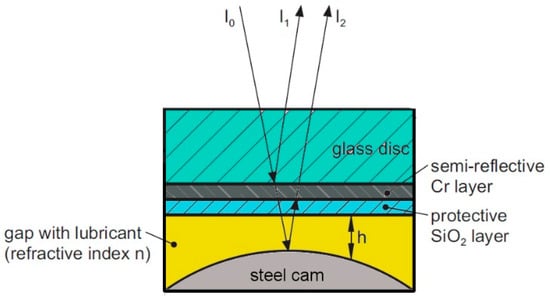 As mentioned in the introduction, optical interferometry is a well-known powerful technique for the estimation of the shape and thickness of non-conformal lubricated contacts, developed in the 1960s []. This technique is particularly efficient under transient conditions, for which the use of other methods such as capacitance or electrical resistivity is not strictly suggested. Optical interferometry is typically used in ball-on-disc test rigs, but it can be applied to contacts between bodies of different shapes (as a cylindrical cam) and a transparent surface (usually the plane surface of a disc). It is generally based on the interference pattern created by the light beam reflected by a semi-reflecting chromium layer applied to the surface of the disc and the portion of the light beam passing through the fluid, if present, and reflected by the body. Sometimes the glass disc can be coated, on the side of the contact, with a further layer of silicon dioxide to protect the surface from abrasion and also to increase the measurement range towards lower thicknesses. The two beams cover different distances and a phase shift between the two light waves occurs. The interference of the two beams produces greater visibility when the intensity of the two reflected beams is similar. Since the investigation is usually limited to the contact region, the angle formed by the incoming and the reflected beams is very little and practically negligible. The resulting wave will have an amplitude ranging from zero to twice the amplitude of the original wave, that is, destructive and constructive interference, in reference to the phase difference between the two waves. Thus, the interference pattern, consisting of bright and dark fringes, will be visible when monochromatic light is used. The interference pattern results, in white light, in a graduation of colors due to the delay of the beams, which is related to the film thickness. In Figure 4 the basic principle of the optical interferometry technique for fluid film measurement is shown.