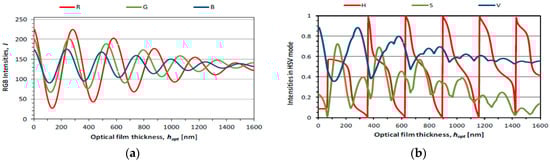 The interference light intensity I given by the interference of two beams, with intensities I1 and I2 respectively, can be approximately related to the optical film thickness hopt with the following Equation (1), taking into account the refractive indices ni of the traversed media of thickness hi and the phase difference ϕ caused by the reflection []: