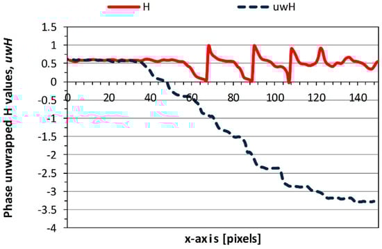 H and unwrapped signals uwH along a pixel row starting from the center of Figure 6a.