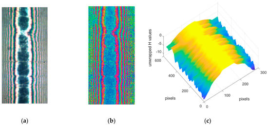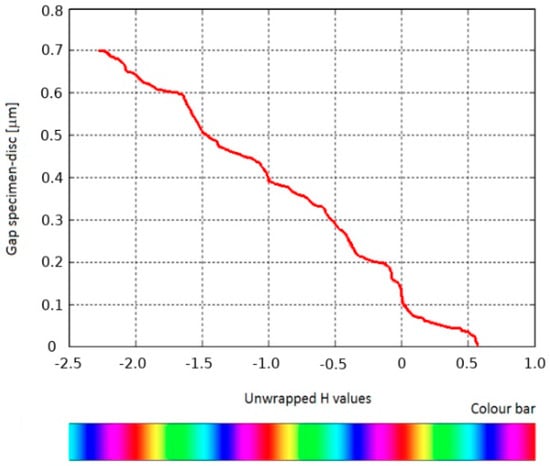 The trend of H is similar to a periodical signal often referred to as “wrapped” hue []. By using an algorithm that adds or subtracts an integer to all values subsequent to a discontinuity, a continuous signal—usually called “unwrapped” hue—is reconstructed. The methodology is described in detail in Reference [] for circular point contacts. The mathematical processing of the wrapped hue values may lead to an amount of noise and uncertainty in the measurement, as shown in Figure 7 where an example of conversion from H to the unwrapped signal, uwH, referred to the processing of the interference image shown in Figure 6a, is shown.