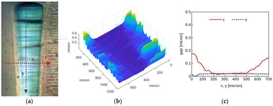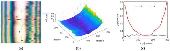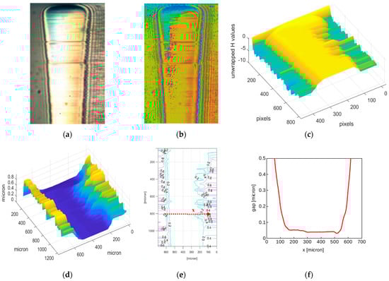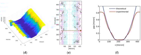 The interferogram of Figure 10a, with a size of 213 × 563 pixels, was captured with a microscope magnification leading to a pixel length of 1.55 μm. The related 3D unwrapped signal (Figure 10c) has been obtained using 0.1 as a threshold value. The unwrapping procedure has been performed on a sequence of lines crossing the interferometric fringes in order to obtain the gap distribution through the contact region. Figure 10d,e show the 3D representation and the contour lines of the body distance distribution obtained by a successive processing, while a comparison between theoretical and evaluated contact profile along the x-axis in Figure 10e is shown in Figure 10f.