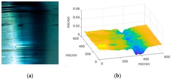 In Figure 13 the cam nose being in contact with the follower (rotation angle = 0°) is shown. The normal load was 250 N, the entraining velocity 38 mm/s and the curvature radius was 6.3 mm. The interference image of Figure 13a refers again to the zone close to the cam’s extremity. The bigger load and lower velocity together with the slope of the cam produce very low values of the film thickness captured by the elaboration, as shown in the 3D diagram of Figure 13b (note the different full scale of the vertical axis compared to that of Figure 12d).