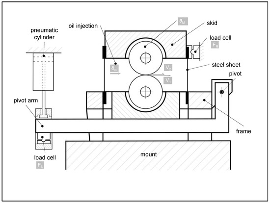 For the determination of the coefficient of friction, an FZG twin-disk test rig designed by FZG/Stößel [27] is used. Figure 1 shows the mechanical layout of the test rig schematically. Two cylindrical disks are press-fitted onto axially parallel shafts. The shafts are independently driven by two electric motors. The disks are designed with a diameter of 80 mm and a width of 20 mm. Continuous variation of speed is allowed by traction drives located between the motors and driving shafts. A pneumatic cylinder applies the normal contact force in the disk contact by the pivot arm. The pivot arm is located where the lower disk is mounted. The upper disk is fixed in a skid. This skid is attached to the frame by thin steel sheets. The skid is supported laterally by a load cell. With this load cell, the friction force in the disk contact for sliding velocities can be measured as the reaction force with hardly any displacement of the skid. The lubricant is placed directly into the inlet region of the disk contact by injection lubrication. A heating and cooling system is included to maintain and control the temperature of the lubricant [28].